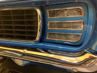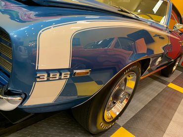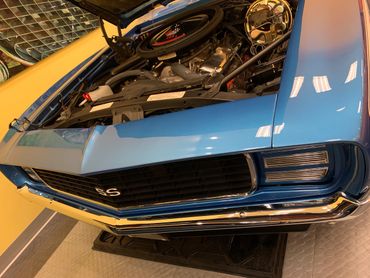 Per the Trim Tag description LeMans Blue with White SS Stripe. Upgraded 15 inch rally wheels with F 70-15 Goodyear Polyglas tires. Correct D 80 Spoilers. Rally Sport option which includes Hide-Away headlights with rare washer system, simulated rear fender louvers, wheel opening moldings and black body sills. This Camaro also has a late year option ZL2 Ducted Hood that was added as a "Day 2" option.